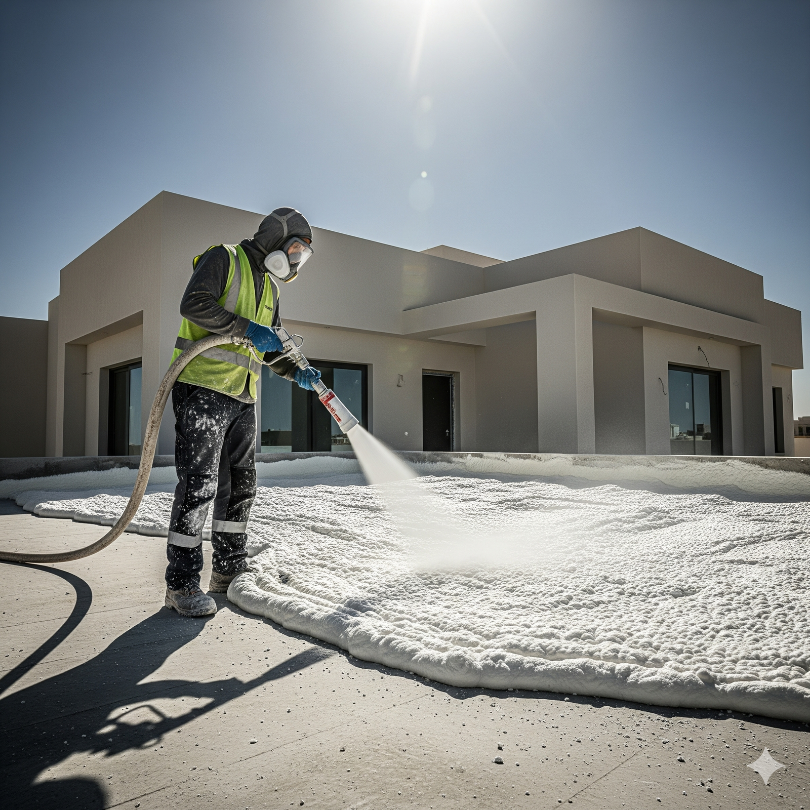 4. عملية الرش: رش الفوم بالسماكة المطلوبة (عادة من 3 إلى 5 سم).